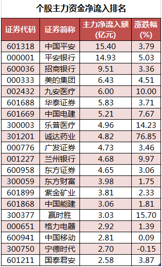 个股来看,今日有1498只个股获主力资金净流入,其中,69股获主力资金净流入超1亿元。中国平安获主力资金净流入最多,净流入金额为15.4亿元;主力资金净流入居前的个股还有平安银行、招商银行、美的集团、九安医疗、华泰证券,净流入金额分别为14.93亿元、9.51亿元、6.43亿元、6亿元、5.83亿元。
