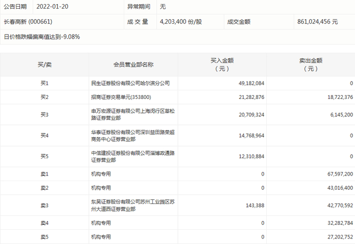 长春高新今天跌停。盘后数据显示,4个机构出现在龙虎榜单上,合计净卖出1.7亿元;申万宏源证券有限公司上海闵行区莘松路证券营业部买入2070.93万元,同时卖出614.52万元;东吴证券股份有限公司苏州工业园区苏州大道西证券营业部买入14.34万元,同时卖出4277.06万元。