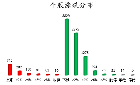 截至收盘,沪深两市合计745只个股上涨,3829只个股下跌,平盘个股34只,停牌的个股12只。不含当日上市新股,共有50只个股涨停,31只个股跌停。连续涨停天数看,汇通集团已连收14个涨停板,连续涨停板数量最多。