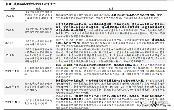 连续重磅储能政策文件出台,抽蓄价格形成机制完善。随新能源装机增速加快, 相应储能设施需配套建设以辅助大量新能源并网,2021 年以来中央连续发布 针对储能建设的相关政策文件。2021 年 4 月,《关于加快推进新型储能发展的 指导意见(征求意见稿)》提出对于电网侧储能设施提出“建立电网测独立储 能容量电价机制,研究探索电网替代性储能设施成本收益纳入输配电价回收”。