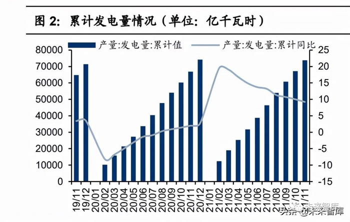用电需求反弹明显,增长率回归疫情前序年份水平。自 2020 年四季度以来, 我国疫情控制情况良好,经济复苏国内外需求提升背景下国内产能扩长,上游 原材料、高耗能企业用能需求旺盛,加之电气化程度提升。在 2020 年上半年 同比基数较低的情况下,全社会一季度单月用电量同比上升 26%、19%和 21%,疫情后用电量需求增速反弹效应明显。进入第二季度,用电同比增速下 降至 13%-14%,第三季度及 10、11 月份用电量同比增速下降至个位数。若排 除受疫情影响的 2020 年份数据,相较 2019 年同期单月用电量数据来看, 2021 年复合增长率维持在 7%-9%的高位区间,已回归疫情前序年份用电量正 常增长率水平,并略有提高。