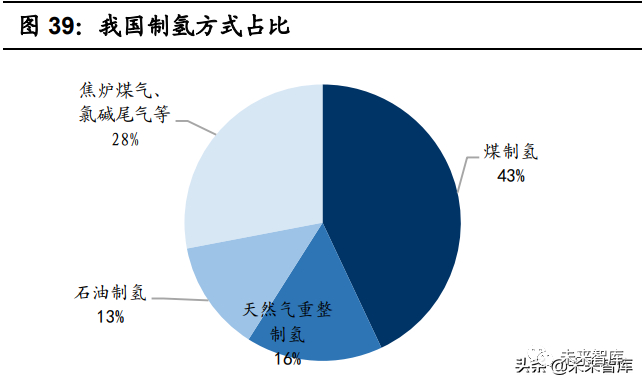 “贫油少气”的资源禀赋决定了我国煤制氢为化石燃料制氢的主要方式。受限 于我国“贫油少气”的资源禀赋,尽管均以化石能源制氢为主要手段,但我国 煤制氢占比高达 43%,天然气及、石油制氢仅占 29%,而全球制氢方式中, 煤制氢占比仅为 18%,天然气占比达到 48%。电解水制氢方面我国 2020 年未 产生大规模电解水制氢产量,产量微小,预计随制取设备成本以及绿电价格下 降,未来电解水制氢占比将不断上升。