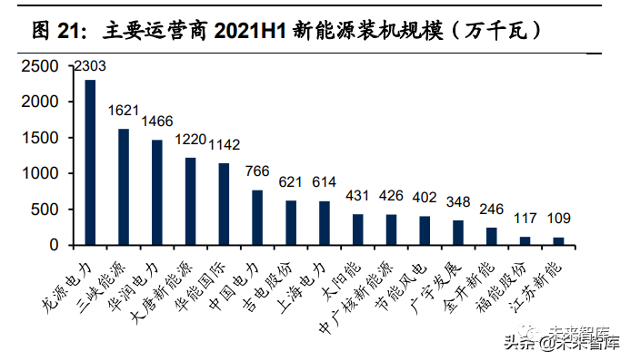 同时新能源运营领域资本市场运作持续升温。2021 年 6 月,三峡能源以纯正 新能源公司身份正式登陆 A 股平台,成为 A 股最大新能源公司。2021 年 12 月龙源电力实现 A+H 上市落定。此外各类转型发展新能源公司增加,借助资 本市场融资发展新能源。
