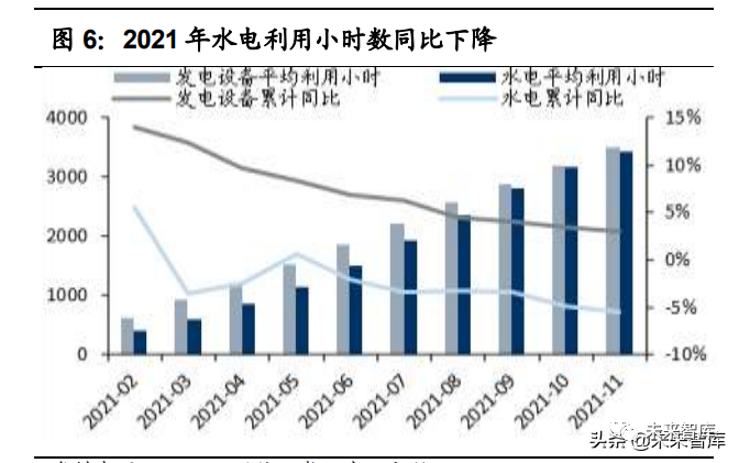 南方来水偏枯,东北风况欠佳,煤炭供需历史性紧张态势,地方性缺电情况频 现。全社会用电需求高增背景下,2021 年发电设备平均利用小时数同比明显 提升,发电设备整体利用小时数明显提高。然而,今年上半年水电来水偏枯, 影响云贵川外送两广的电量,云南、广东及广西部分地区出现有序用电情况;在东北地区,三季度末煤炭供需历史性紧张态势,加之受风电出力的影响,辽 宁、吉林地区电力供应出现明显缺口,一度影响居民用电。整体来看,火电、 核电利用小时数同比增速均在 5%-10%左右,提升更为明显。