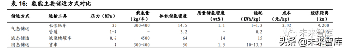 1) 目前中国高压气态储运氢技术相对成熟,依靠压缩机将氢气压缩到储氢瓶 中(一般为 30MPa),再利用集装格和长管拖车等工具进行运输,适用于 短距离、小规模运输。管道输氢是实现大规模、长距离气氢运输的方式, 目前我国仅有 100km 管道建设,未来发展潜力较大;