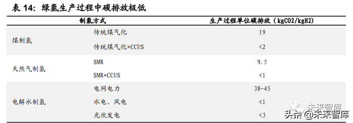 绿氢制造过程中碳排放量极低,可充分助力“双碳”目标的实现。根据测算, 化石能源制氢由于利于含碳元素作为原料,不可避免地会产生碳排放,而绿氢 利用水电、风电以及光伏等可再生能源及水作为原料,可实现超低碳排的制氢 效果。其中水电电解水制氢的单位碳排放<1 kg CO2/kg H2,光伏发电则<3 kg CO2/kg H2。在面临“碳达峰”“碳中和”需求下,绿氢是最具可持续性且接近 于无碳排放的选择。
