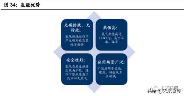 氢能较传统二次能源具备多方面优势。相较于传统含能体能源,氢能的使用具 备无碳排放、无污染的绿色能源性质,在不考虑上游制造来源的情况下,为优 质的绿色能源。在运、储方面,氢气具备更高的能量密度及安全性:氢气的热 值(143kJ/g)是石油的 3 倍,煤炭的 4.5 倍,在泄露后极易扩散,爆炸下限 浓度高于汽油和天然气。在终端使用方面,目前氢能应用场景十分广泛,其中 作为储能方式参与电网辅助是帮助电力实现时间层面转移的有效手段。