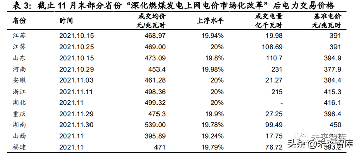 2021 年 10 月 11 日发布《国家发展改革委关于进一步深化 燃煤发电上网电价 市场化改革的通知》。主要提出,燃煤发电电量原则上全部进入市场(70%至 100%)将燃煤发电市场交易价格浮动范围由现行的上浮不超过 10%、下浮原 则上不超过 15%,扩大为上下浮动原则上均不超过 20%,高耗能企业市场交 易电价不受上浮 20%限制。电力现货价格不受上述幅度限制。前多省展开市 场交易,电价基本实现基准价 20%上浮。