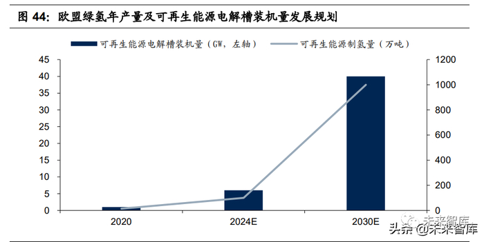 1) 欧盟:2020 年 7 月 8 日,欧盟发布欧盟《氢能战略》EU Hydrogen Strategy,文件指出当前氢能发展的首要任务是开发主要利用风能和 太阳能生产的可再生氢。欧盟的氢能发展将分为三个阶段进行:一是 从 2020 年到 2024 年,支持欧盟安装至少 6 吉瓦的可再生氢电解槽, 生产多达 100 万吨的可再生氢。二是从 2025 年到 2030 年,氢成为欧 盟综合能源系统的内在组成部分,欧盟至少要有 40 吉瓦的可再生氢电 解槽和多达 1,000 万吨的可再生氢生产。三是从 2030 年到 2050 年, 可再生氢技术成熟,并在所有难以脱碳的部门大规模部署。