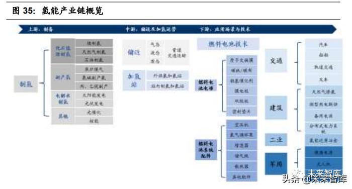 制备方式多样,应用场景广泛。氢能产业链较长,上游涉及制取、储运及加注 等多个流程,其中制取方式灵活多样,目前主要利用成本较低的化石能源制氢, 储运则通过气态实现。中游为氢燃料电池及其系统配件的制造,下游应用方面, 氢能被广泛应用于工业、交通及建筑等领域。
