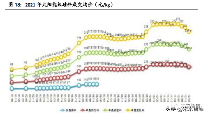 光伏经历过硅料价格大幅上涨后,目前已有所回调。过去 1-2 光伏产业需求量 大幅增加,带动产业链上下游的产能扩张,在硅片、电池片、组件企业的大幅 扩产的同时,硅料产能增长相对较慢,导致硅料价格今年大幅上涨。根据 PVinfo 统计,2021 年单晶致密块料主流价格从年初 1 月份每公斤 85 元快速上 涨,6 月份涨至每公斤 206 元人民币,半年间涨幅达到 142%。之后能耗双控 政策让 Q3、Q3 硅料价格进一步上升,11 月涨至每公斤 269 元人民币,相比 1 月的涨幅高达 216%,该价格水平已经涨至 2011 年以来的最高价位。相应一 定程度抑制了 2021 年新增光伏装机规模。