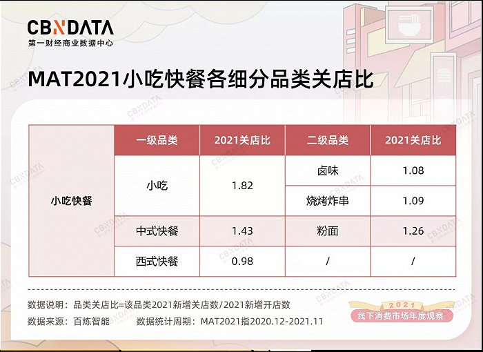 CBNData“2021线下消费市场年度观察”相关数据也显示,在线下消费业态中表现最为乐观的餐饮业,快餐小吃等“小店”业态尤其发挥主导作用,驱动行业持续焕发生机。其中,卤味凭借突出的资本热度,更庞大的店铺规模,以及更低的关店比,成为“小店”业态中最具活力的一条赛道。