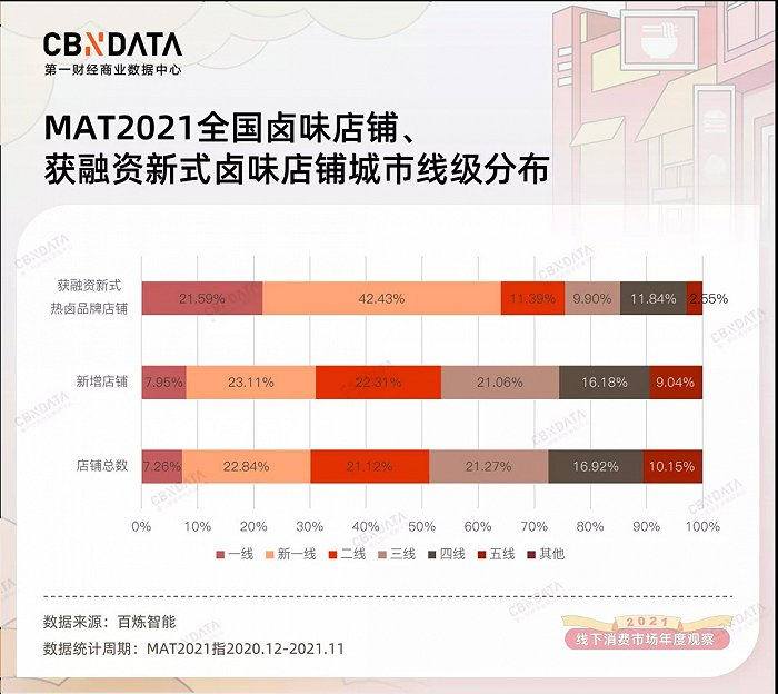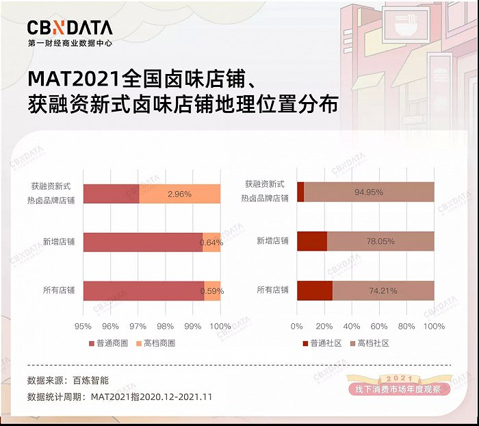 卤味门店选址“升级”的现象,主要由新式热卤品牌驱动。据CBNData统计,2021年获得融资的新式卤味品牌,超六成店铺都分布在一线、新一线城市,比卤味行业整体高出约35个百分点;分布于高档商圈、高档社区的店铺比例,比卤味行业整体分别高出4倍、20个百分点。