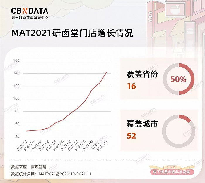 卤味在产品层面“回归”鲜卤热卤,即是对消费者需求升级的迎合,也意味着鲜卤热卤在供应链管理、产品标准化方面已经成熟。而供应链基础的完备,助力新式热卤品牌激进扩张。以研卤堂为例,2021年,研卤堂门店数量增长近2倍,在地域拓展上完成对16个省份、52座城市的覆盖。分别成立于2019年、2020年的热卤食光、卤虎将,均在2021年实现门店的4倍增长。