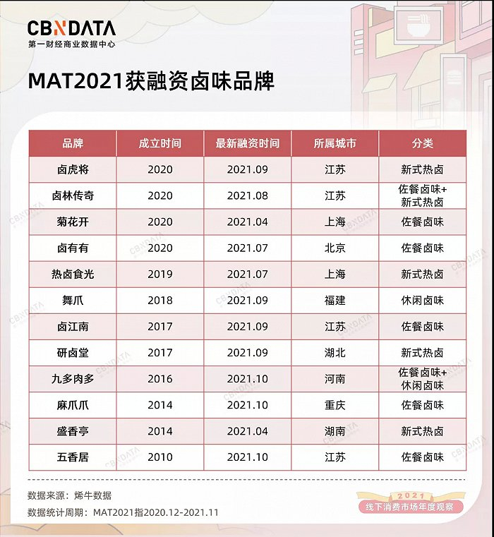 纵观2021年,佐餐卤味品牌紫燕百味鸡冲刺上市;年内获得融资的卤味品牌中,佐餐卤味和新式热卤是最受资本青睐的类型,也有部分品牌走“复合”路线。过去主要由“三巨头”打下的由休闲卤味占据行业头部的局面或将被打破。卤味赛道的竞争重点,或已从消闲零食,向家庭佐餐甚至热卤快餐转移。