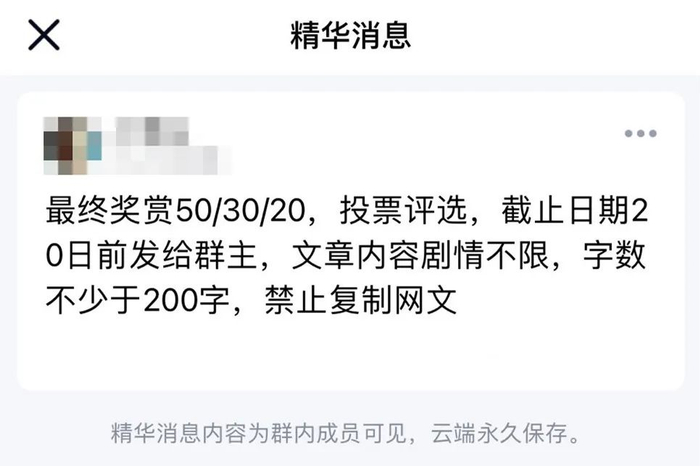 通常,群成员在群里发布女性照片后,群成员会对图片发表评价,常常有人“志愿”为照片“配羞辱文”。据群主发布的公告,群内还会举办比赛,群成员可以投稿“配文”领奖,投稿字数不少于200字,结果由群成员投票评选,最终奖赏分为50元、30元、20元三个档位。除了“志愿”书写,群内也有写手定制撰写“配文”。一名在群内有偿招募配文写手的群成员告诉澎湃新闻记者,写手写一篇“配文”酬劳在10元到40元不等,一天需要写4-8篇,要求“脑洞大,字数够”。