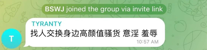 电报群,指跨平台即时通讯软件Telegram里的聊天室。在聊天室里,用户可以自由地相互交换加密与自毁消息,发送照片、视频等所有类型文件。在这些聊天室里,女性们的图片被群友任意羞辱,其中有人自称照片中是其女朋友和身边女性,供他们围观、意淫。群内还有男性用户随意上传自己生殖器官的视频、图片。进去之后,赵卓的第一反应是“特别恶心”。一些图片引起赵卓生理上和情绪上的强烈反感。