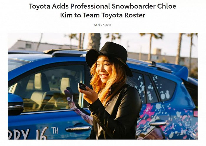 2016年,克洛伊·金加入Team Toyota Roster,丰田也是克洛伊·金的独家汽车合作伙伴。在丰田看来,此次合作标志着丰田于2006年推出的运动员赞助模式的延续,在合作期间的比賽中,克洛伊·金会在她的头盔和雪板上佩戴丰田的标志。