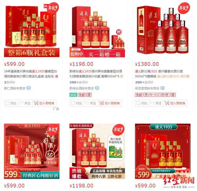 红星资本局从京东、天猫等电商平台发现,各种品牌的“遵义1935”公开售卖,让人莫衷一是。涉及的品牌包括“遵义红”“黔续台”“黔北魂”“金秘名”“皇达”“黔科”“贵载”“东泰”等,均打出了“遵义1935”的名义。且在色彩、文字、排版、构图和包装上,均和茅台原来的“遵义1935”相似度极高。
