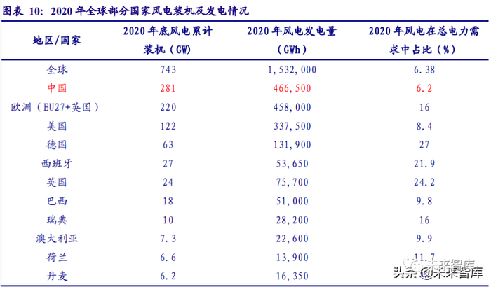 我国是风电第一大国,2020 年底我国风电累计装机量比排在第二名的美国多 130.3%,无 论是风电装机量还是风电发电量,均处于世界首位,风能资源处于世界领先水平。但是根据 2020 年风电在总电力需求中占比数据来看,我国风电仅占 6.2%,远落后于其他发达国家,甚 至略低于全球平均水平,说明我国风电还未被普遍应用。其中主要原因是因为 2020 年以前风 电、太阳能发电等新能源发电成本较高,风电电价高于传统燃煤发电,故更多选择传统火电。