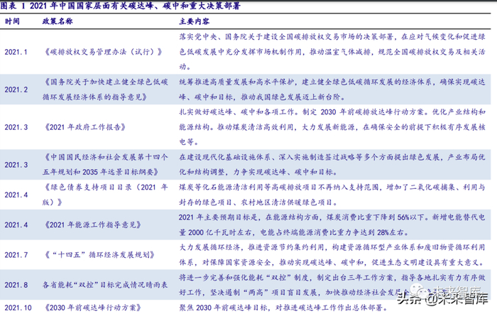 2021 年 10 月,国务院印发《2030 年前碳达峰行动方案》,该方案聚焦 2030 年前碳达峰 目标,对推进碳达峰工作作出总体部署。涉及到建材行业碳达峰的指导意见包括:加强产能 置换监管,加快低效产能退出,严禁新增水泥熟料、平板玻璃产能,引导建材行业向轻型 化、集约化、制品化转型。推动水泥错峰生产常态化,合理缩短水泥熟料装置运转时间。因 地制宜利用风能、太阳能等可再生能源,逐步提高电力、天然气应用比重。鼓励建材企业使 用粉煤灰、工业废渣、尾矿渣等作为原料或水泥混合材。加快推进绿色建材产品认证和应用 推广,加强新型胶凝材料、低碳混凝土、木竹建材等低碳建材产品研发应用。推广节能技术 设备,开展能源管理体系建设,实现节能增效。