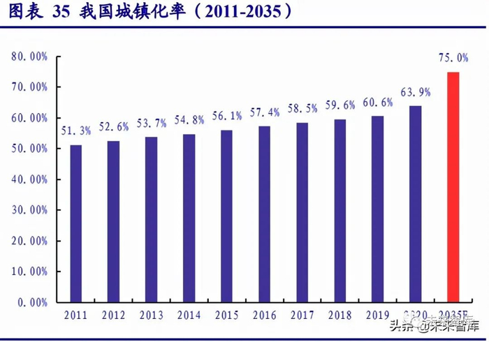 从目前的城市化进程来看,预计 2035 年城镇化率将达到 75%左右,和发达国家 80%的水 平基本持平。未来居民的新增住房需求降低,消费建材将进入存量时代。叠加“房住不炒”政 策,居民对房屋质量的要求将进一步提升。(报告来源:未来智库)