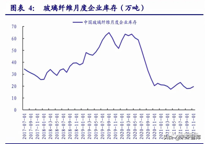 自 2020 年下半年国内疫情得到有效控制,玻璃纤维市场需求持续向好。2021 年 1-11 月 玻璃纤维需求持续增加,一方面受益于国内新应用领域的扩张,另一方面受海外疫情防控的逐 步恢复。8 月起玻璃纤维海外市场需求迅速回涨,10 月份玻璃纤维及制品月度出口量同比增长 43.6%,环比 9 月增长 10%。随着国外企业的复工及市场的复苏,预计明年玻璃纤维海外需求 将进一步增加。多种需求叠加及行业产能的缩减,使市场处于紧俏状态, 截至 2021 年 11 月, 玻璃纤维月度企业库存为 19.64 万吨,同比减少 3.87%,环比增加 8.06%,玻璃纤维库存环比 虽有增长,但仍处于历史较低水平。