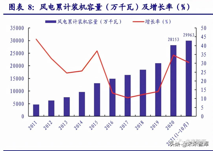 “十三五”期间,风电行业快速发展,全国风电并网装机容量年均增长 16.9%。2020 年全 国风电累计装机容量 28153 万千瓦,同比增长 34.6%,占全国全口径发电设备容量的 12.8%, 占非化石电源装机容量的 29.5%,远超过“十三五”规划目标。随着碳中和政策的推进,“十 四五”规划目标进一步提高,大力提升风电、光伏发电规模,有序发展海上风电,2025 年非化 石能源占能源消费总量比重提高到 20%左右。于此同时,我国领导人在气候雄心峰会上宣布 2030 年我国风电、太阳能发电总装机容量将达到 12 亿千瓦以上。