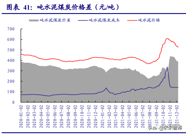 利润端方面,2021 年 1-11 月吨水泥煤炭价格差均值为 310.11 元/吨,较 2020 年吨水泥 煤炭价格差均值(340.77 元/吨)下降 9%。利润水平下降主要系 2021 年煤炭价格高位导致水 泥生产成本大幅增加,以及今年淡季水泥价格大幅下降所致。随着国家对煤炭价格的管控,动 力煤价格大幅回落,水泥企业成本压力得到缓解,水泥价格也随之有所下降。因天气转冷水泥 市场需求下降明显,部分水泥企业通过降低水泥价格刺激市场需求,加上近期煤炭价格趋于平 稳,水泥价格降幅大于煤炭价格回落带来的成本的下滑,导致近期吨水泥煤炭价差环比走低, 同比涨幅收窄,行业盈利能力下降。截至 12 月 8 日,吨水泥煤炭价格差为 385.55 元/吨,环 比下降 11.67%,同比上涨 11.73%。预计后续吨水泥煤炭价格差将继续回落,但略高于历史同 期。