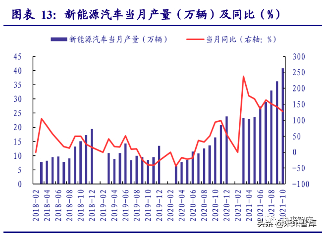 根据国家统计局数据统计,2021 年 1-10 月新能源汽车累计产量为 270.1 万辆,同比增加 164%,较 1-9 月增加 18.41%;10 月当月产量为 40.8 万辆,同比增加 127.9%。受益于国家对 新能源车的大力支持,近年来新能源汽车产量快速增长,销量也大幅提升。根据《新能源汽车 产业发展规划》要求,至 2025 年我国新能源新车销量占总销量的占比应达到 20%。我国新能 源汽车正处于加速发展阶段,新能源汽车轻量化更是处于发展初期,预计未来新能源汽车市场 将为玻璃纤维行业带来巨大需求。