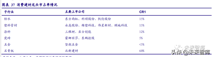 消费建材板块细分子行业众多,包括防水、管材、五金、瓷砖、涂料、石膏板等。除石膏 板行业集中度较高之外,其他行业均呈现较为分散的格局,行业内排名第一的龙头公司市占率 不到 20%。