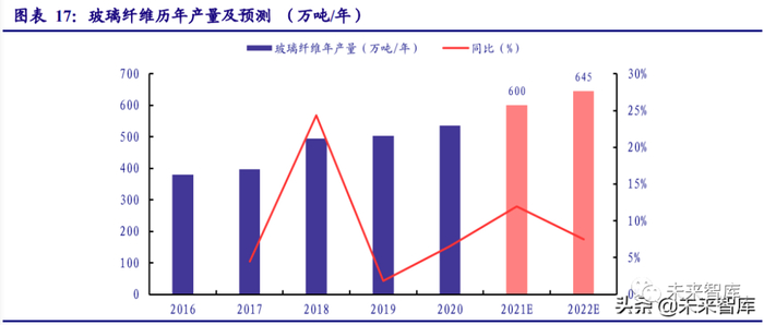 根据各企业公开信息,2021 年玻纤行业新增产能约 64 万吨,结合历年玻璃纤维年产量数 据,预计 2021 年玻纤年度产量约 600 万吨/年,同比增长 11.9%。结合各企业公开信息及卓创 资讯资料,我们预计 2022 年玻璃纤维新增产能约 45 万吨,其中包括,中国巨石 10 万吨、长 海股份 10 万吨、邢台金牛 10 万吨及重庆国际 15 万吨。中国巨石埃及生产线预计投产时间为 2022 年年底,因年底投产具有一定不确定性,明年预计新能产能暂时未包含在内。则预计 2021 年玻纤年产量约 645 万吨/年,同比增长 7.5%。