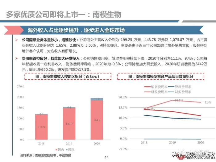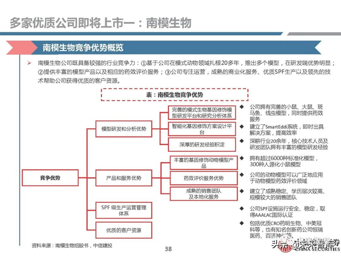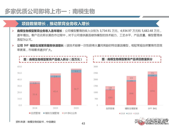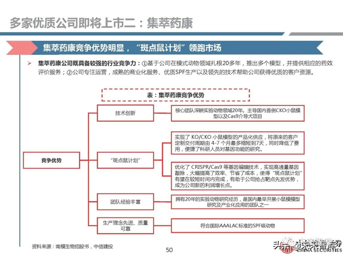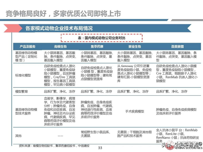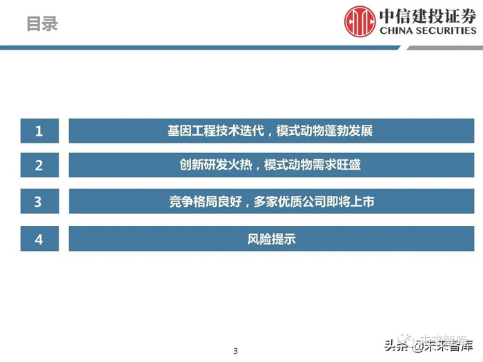 中国模式动物出海顺畅:①资质上,南模生物、集萃药康、百奥赛图等头部企业纷纷获得AAALAC认证,动物可以出 口;②技术上,CRISPR/Cas系统的基因编辑技术发展时间并不长,国内和海外几乎同步发展;③人才上,国内工程 师红利亦将体现在模式动物领域‘④业绩上,头部企业均在海外设立子公司,海外业务收入实现高速增长,成为公司 业绩的重要增长点之一。(报告来源:未来智库)
