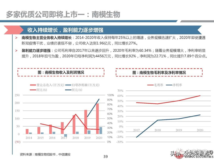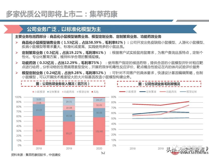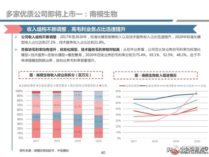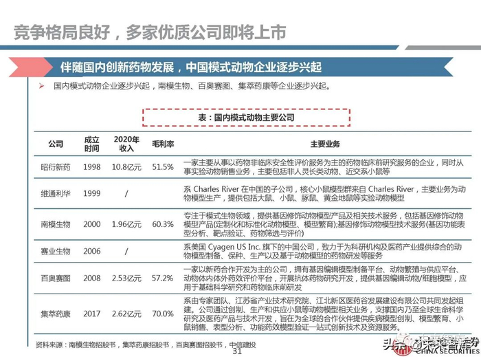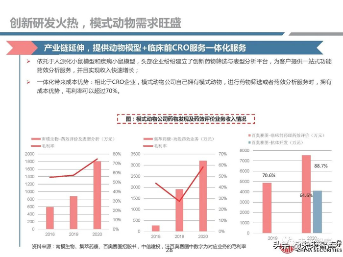 依托于人源化小鼠模型和疾病小鼠模型,头部企业纷纷建立了创新药物筛选与表型分析平台,为客户提供一站式功能 药效分析服务,并且实现收入快速增长;一体化带来成本优势:相比于CRO企业,模式动物公司自己拥有模式动物,进行药物筛选或者药效分析服务时,拥有 成本优势,毛利率可以超过70%。