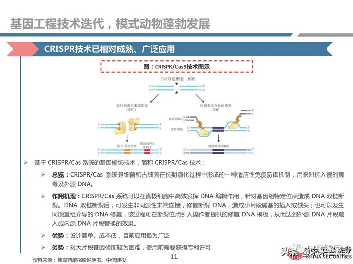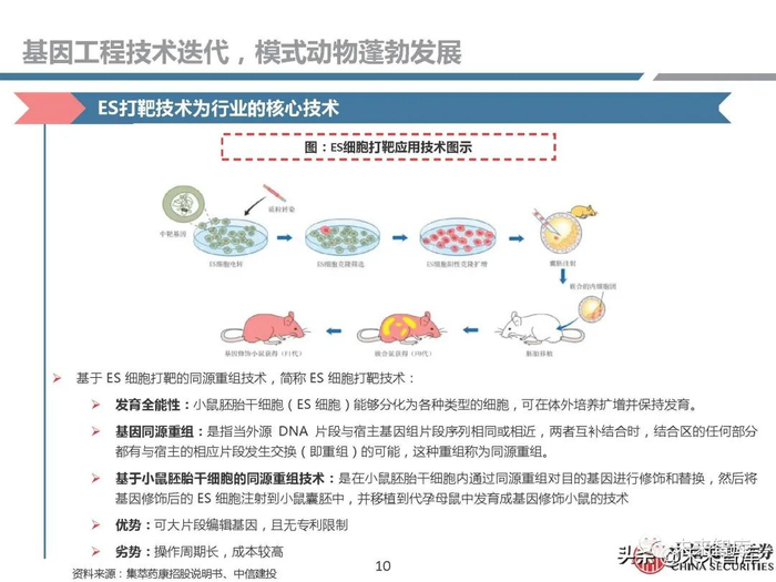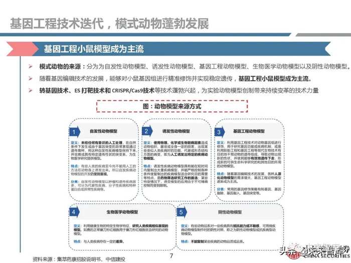 模式动物的来源:分为为自发性动物模型、诱发性动物模型、基因工程动物模型、生物医学动物模型以及阴性动物模型。随着基因编辑技术的发展,能够对小鼠基因组进行精准修饰并实现稳定遗传,基因工程小鼠模型成为主流。转基因技术、ES 打靶技术和 CRISPR/Cas9技术等技术蓬勃兴起,为实验动物模型创制带来持续变革的技术力量。