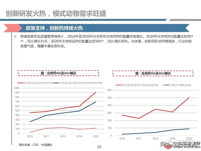 根据国家药品监督管理局统计,2016年至2020年化学药和生物药IND数量持续增长。2020年化学药IND数量达到907 个,同比增长51%;2020年生物制品IND数量达到500个,同比增长60%。总体看,创新药研发热情高涨,行业持续 高景气度,蕴藏丰富投资机会。