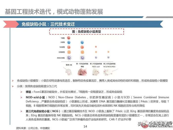 免疫缺陷小鼠模型:小鼠在经特定遗传改造后,剔除特定免疫基因后,携带人类或其他动物的组织和细胞,形成免疫缺陷小鼠模型。