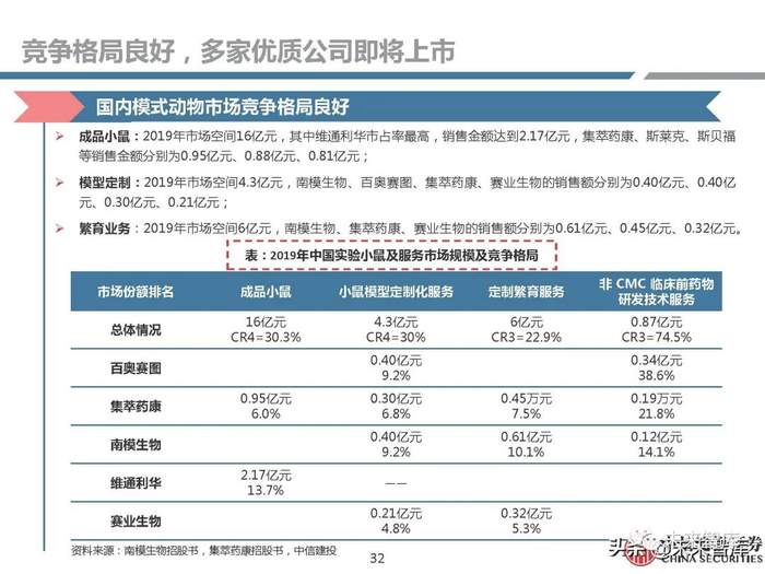 成品小鼠:2019年市场空间16亿元,其中维通利华市占率最高,销售金额达到2.17亿元,集萃药康、斯莱克、斯贝福 等销售金额分别为0.95亿元、0.88亿元、0.81亿元;模型定制:2019年市场空间4.3亿元,南模生物、百奥赛图、集萃药康、赛业生物的销售额分别为0.40亿元、0.40亿 元、0.30亿元、0.21亿元;繁育业务:2019年市场空间6亿元,南模生物、集萃药康、赛业生物的销售额分别为0.61亿元、0.45亿元、0.32亿元。