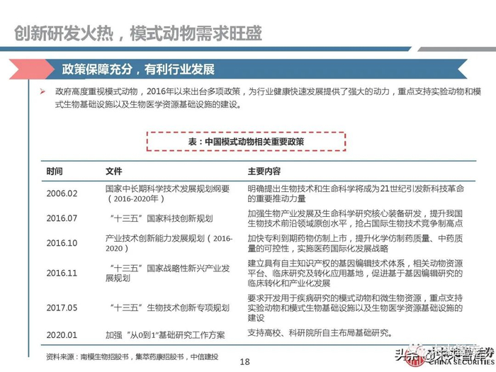 政府高度重视模式动物,2016年以来出台多项政策,为行业健康快速发展提供了强大的动力,重点支持实验动物和模 式生物基础设施以及生物医学资源基础设施的建设。