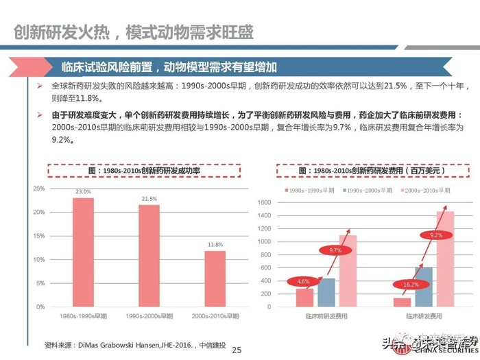 全球新药研发失败的风险越来越高:1990s-2000s早期,创新药研发成功的效率依然可以达到21.5%,至下一个十年, 则降至11.8%。由于研发难度变大,单个创新药研发费用持续增长,为了平衡创新药研发风险与费用,药企加大了临床前研发费用:2000s-2010s早期的临床前研发费用相较与1990s-2000s早期,复合年增长率为9.7%,临床研发费用复合年增长率为 9.2%。
