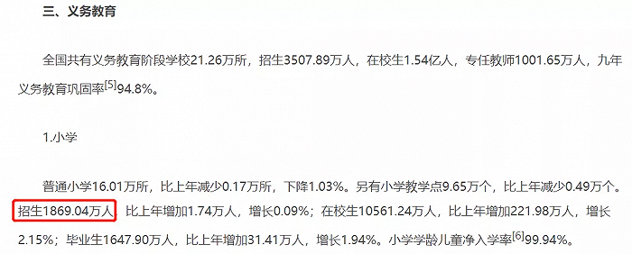 在这些调整中,数2012年上调幅度最大,出生率从当年统计公报的12.1‰调整为14.57‰。按照这个数字,2012年的出生人口实际上远高于当年统计公报公布的1635万人,达到了1973万人。这个调整也和近些年来的小学招生数相吻合——根据教育统计公报,2019年小学招生达到了1869万人,远远超过7年之前出生的人口数。