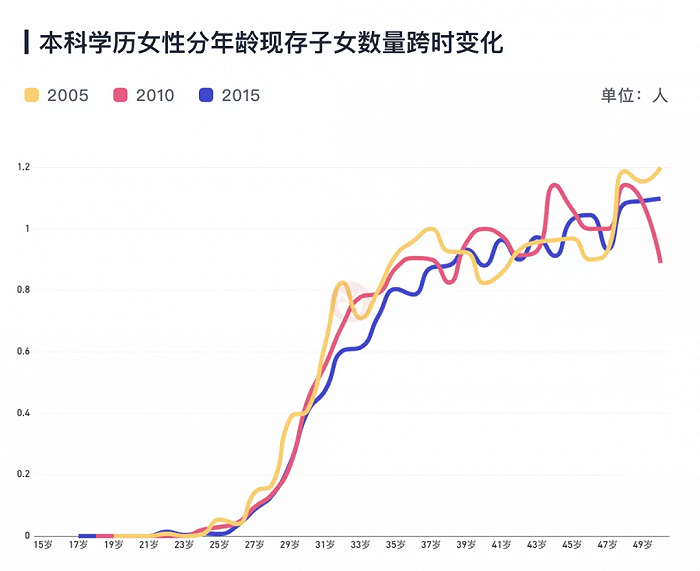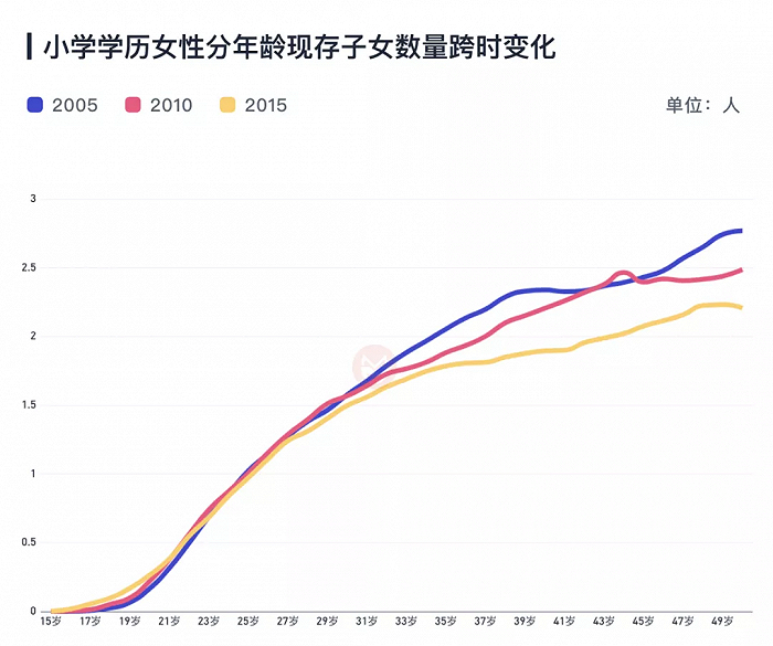 不同教育水平的女性的生育率差异很大,但是同一个教育水平的女性,在不同时间段的生育率,反而是差不多的。一个30岁的本科生女性,无论是在2005年、2010年还是2015年,生育行为都差不多,其累计生育子女数的曲线基本重合。小学学历女性亦是如此,生育行为随着时间的变化并不大。