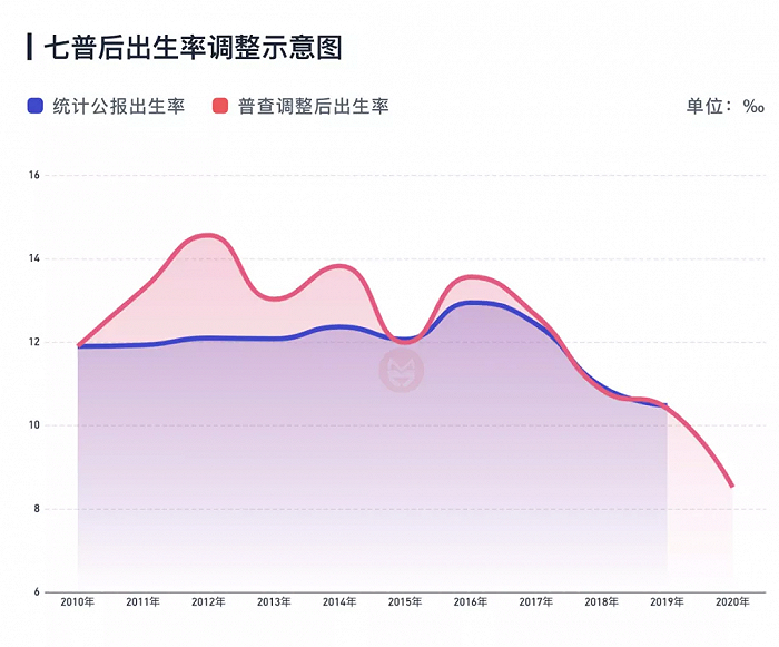 但这并不能代表中国人口出生下滑的真实数字。每年统计局公布的出生人口数字会在十年一度的普查结束后进行调整。在七普结束后,2010年到2015年生育率,从平缓的曲线被上调成了一条先上升再下降的曲线。