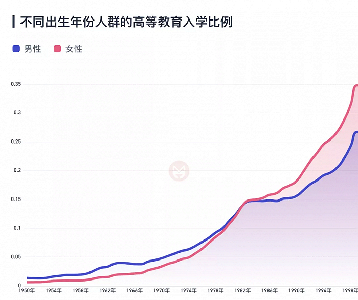 很简单,结构变了。根据第七次人口普查,一名1989年出生的女性,获得本科及以上学历的概率为17.4%。而一名1999年出生的女性,获得本科以上学历的概率则高达34.8%。相比之下,男性上大学的比例上升速度就远不如女性了,1999年出生的男性只有26.7%能上大学,比女性低了8.1%。如果当前的婚配观念没有大的变化,性别间的教育差距可能又会在未来进一步降低结婚率。