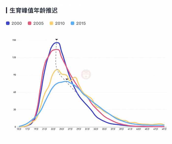 在2000年第五次人口普查和2005年小普查中,生育率最高的年龄都出现在24岁。到了2010年六普和2015年小普查中,生育率最高峰延迟到了26岁,且在30岁以上的生育率下降减缓了。生育行为在整体上有下降,在峰值上有推迟。