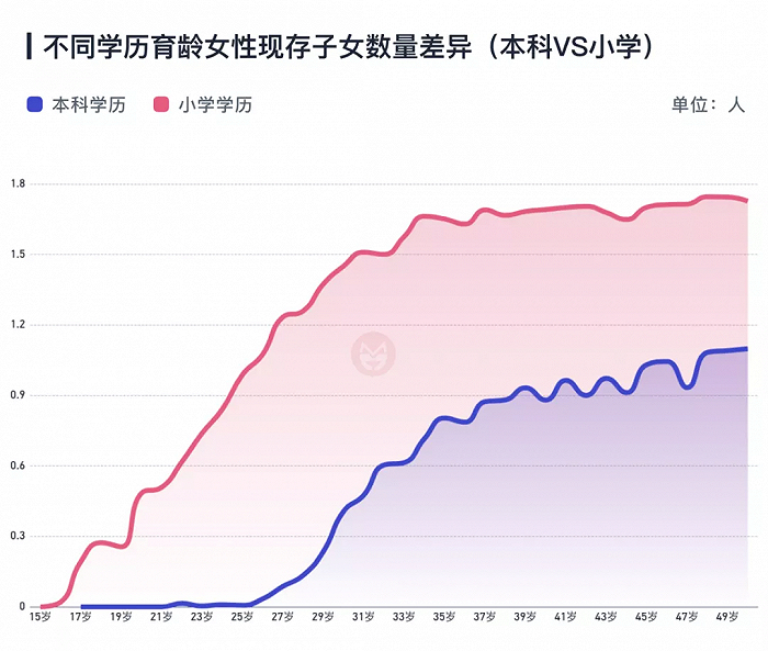 根据2015年小普查,小学学历女性从16岁便开始生育子女,直到35岁达到顶峰,平均在35岁时有1.6个孩子。而本科学历女性从26岁才开始生育,上升得也比较缓慢,到30岁时,平均要比小学学历女性少一个孩子。