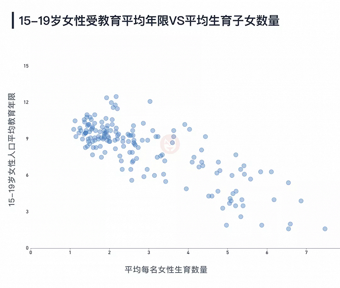 当我们把全世界国家的15-19岁女性教育年限和该国的总和生育率画成散点图,可以看到两者的相关程度非常之高,女性受教育程度的差异,可以解释65%的生育率差异。