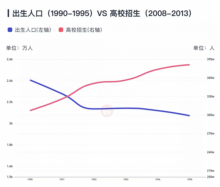 而为何本科和研究生女性占比大幅提高呢?还是得要回到30年前找原因。90年代初,出生人口快速下降,从1990年到1995年5年内就下降了14%,而20年后为这批人口提供的高等教育招生数却在不断上升,5年提高了24%,此消彼长,本科生占比自然就快速提升了。