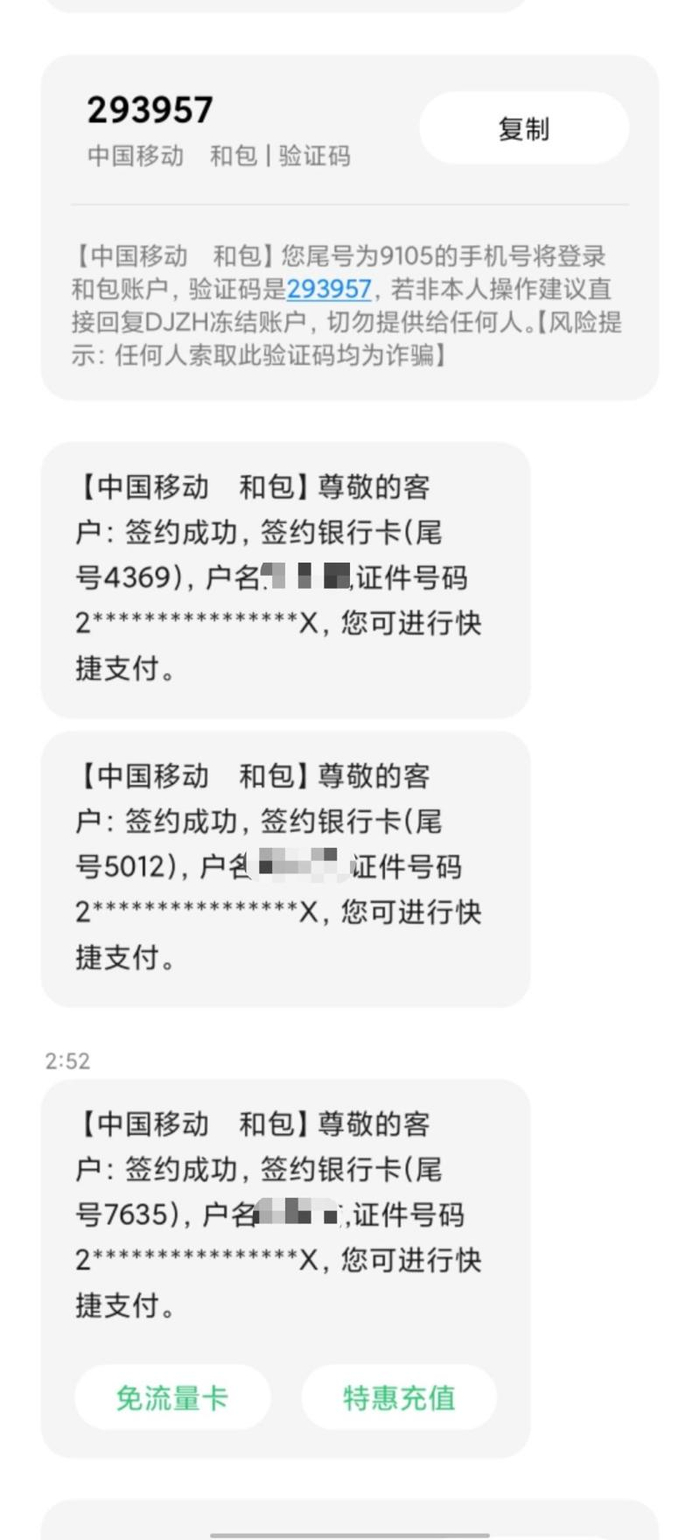 “冬至这天把我从睡梦里叫醒的不是饺子,而是银行卡里的钱没了!”近日,北京通州的刘女士向澎湃新闻反映称,2021年12月21日深夜自己手机里收到了上百条验证码短信,醒来后发现名下多个银行卡被绑定中国移动“和包快捷支付”,其中一张银行卡被盗刷8640元,“其他银行卡也被绑定了,只是里面没有钱,真的是细思极恐。”