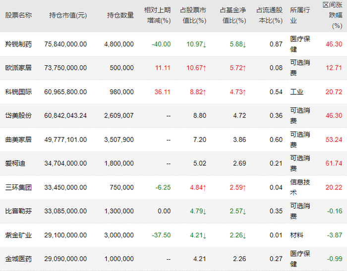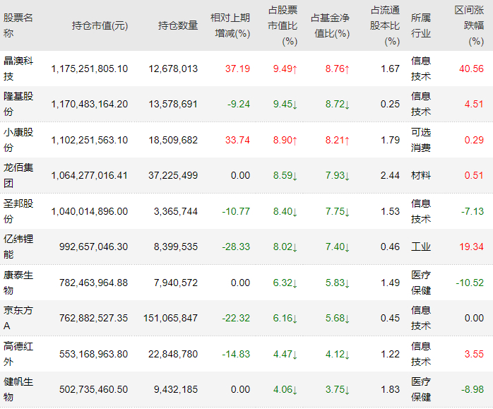 前十大重仓股分别是:晶澳科技(002459)、隆基股份(601012)、小康股份(601127)、龙佰集团(002601)、圣邦股份(300661)、亿纬锂能(300014)、康泰生物(300601)、京东方A(000725)、高德红外(002414)、健帆生物(300529)。